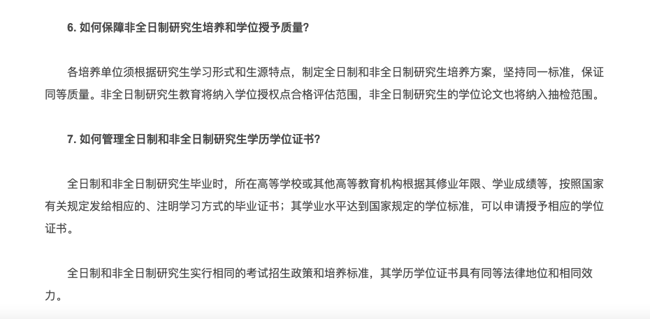 同时,早在2016年,教育部就出台了相关通知办法《关于统筹全日制和非全日制研究生管理有关工作答记者问》,明确了非全日制研究生的证书含金量。